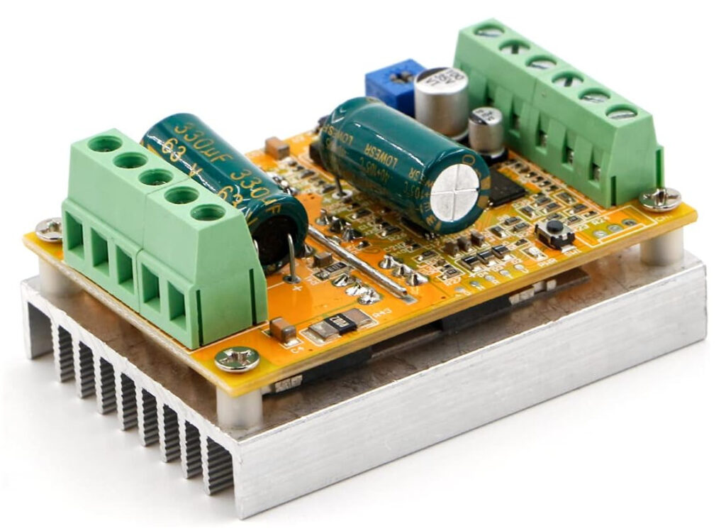 This RioRand motor speed controller board is designed to work with a three-phase brushless DC motors with hall sensors. The part number printed on the board is ZS-Z11H. There is another version of this board that is designed to work with motors without hall sensors. The part number printed on that board is ZS-X11F. Each of these boards go for around $20 on Amazon or E-Bay.